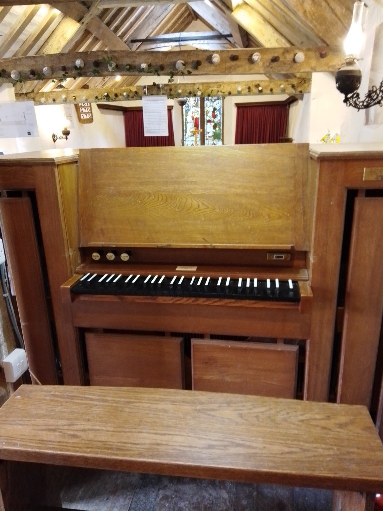 Although being quite small, the organ boasts three complete ranks of pipes. These comprise of stopped flue pipes in 8’ and 4’ pitch and a third open flue rank in 2’ pitch. All the pipework is housed within the organ behind oak case work. The bottom octave of the 8’ rank of pipes make up the rear panelling of the organ’s case and their mouths can be seen at the very bottom of the organ. The larger of these pipes are cut at 90° and extend backwards into the organ in order to obtain the correct length of pipe to allow the correct pitch whilst fitting inside the case. The organ is electrically blown – the only item within the organ that requires electricity.